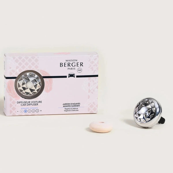 Con este difusor para automóvil Joy Jardin d'Agaves que combina forma redonda y recortes gráficos, Sylvie de France pudo expresar aquí toda su creatividad.
