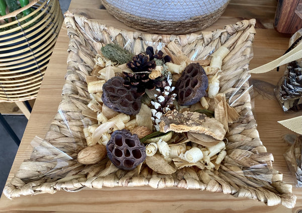 Instrucciones de uso: Abra la bolsa desde abajo para permitir que el contenido se libere en el recipiente de su elección. Organice los elementos botánicos que se exhibirán en la superficie según sea necesario.