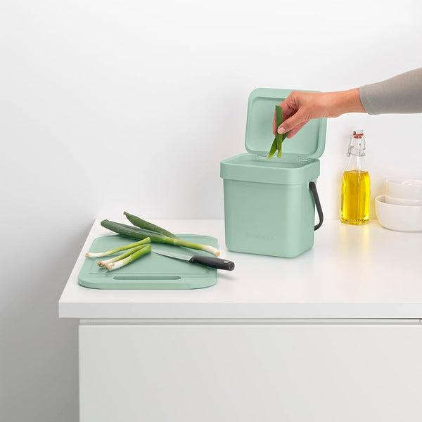 Este cubo tan mono de 3 litros, provisto de una tapa que puede permanecer abierta si se desea, es ideal para tirar mondas, sobras, restos… y cualquier resto orgánico propio de la cocina, en realidad. Para colocar en la encimera o en un cajón.