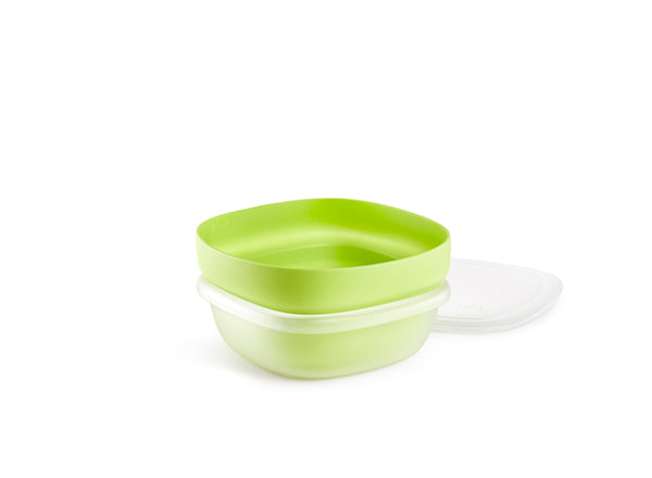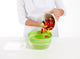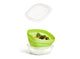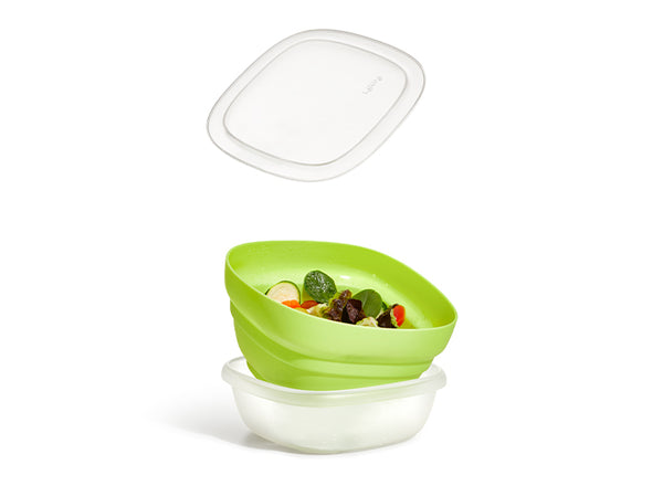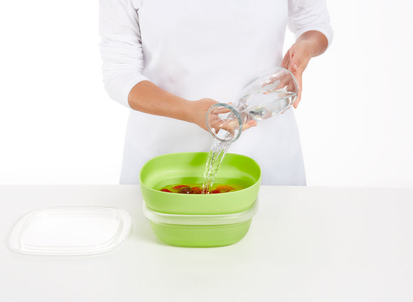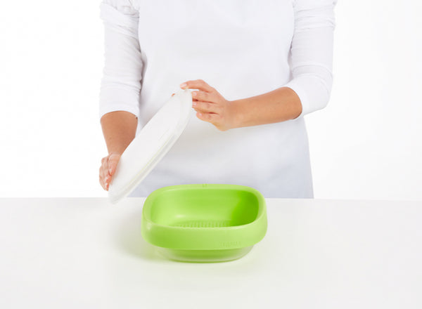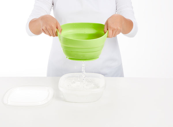¿Cómo lo utilizamos? Abre la tapa y despliega el colador, introduce los ingredientes y el agua hasta la línea indicada, limpia o deja en remojo (10 min.), levanta el colador y sitúalo encima de la tapa (para evitar mojar), desecha el agua que ha quedado en el recipiente base, vuelve a colocar el colador en el recipiente base y pliégalo, coloca la tapa y ¡listo para conservar en nevera hasta su uso!