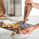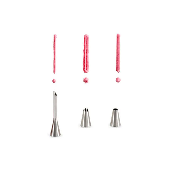 Asimismo, este práctico set incluye 3 boquillas de acero inoxidable de tamaño estándar para todos los usos. Con ellas podrás, por ejemplo, decorar tus tartas, rellenar tus buñuelos y profiteroles y dispensar la masa de cupcakes en los moldes perfectamente. La colocación de estas boquillas se lleva a cabo a través de un adaptador de rosca que te permitirá tener un acople seguro y sin riesgo de fugas. Además, podrás cambiar de boquilla con la manga pastelera llena: ¡pasa de rellenar profiteroles a decorar tartas en un momento!