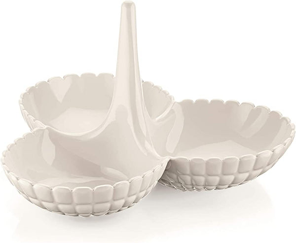 El soporte vertical tiene tres cuencos, diseñados para contener pequeños bocadillos. El sistema de ajuste especial permite colocar otro plato de aperitivos encima del primero, para crear una versión de seis tazones.
