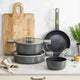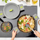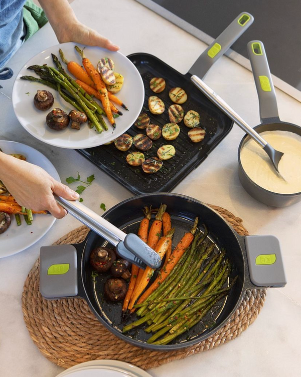 Incluye tapa de cristal termorresistente y dos asas de silicona en colores gris y verde, para coger la cacerola con comodidad.