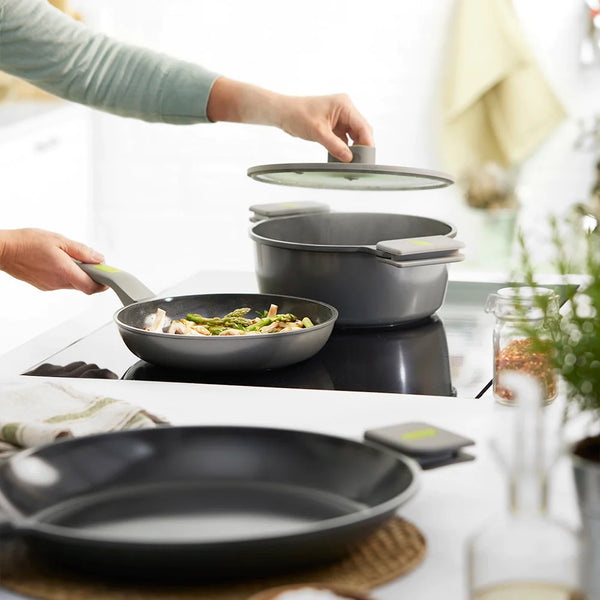 Su diseño es innovador y resaltan los tonos de color gris y verde y sus acabados modernos. Las asas desmontables de silicona de color gris con detalles en color verde, identificativo de la colección Life, permiten un agarre seguro y cómodo. La tapa de vidrio termorresistente dispone de mango ergonómico y aro de silicona desmontable anti impactos, para un encaje perfecto.