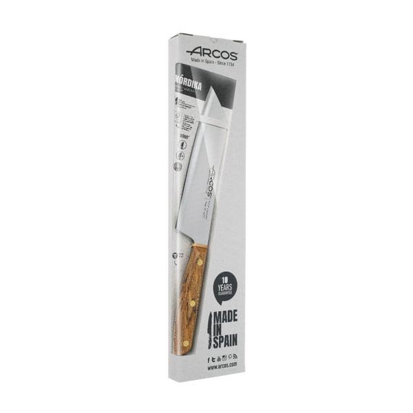 Fabricado íntegramente en nuestras instalaciones de Albacete, cuenta con una hoja de acero inoxidable NITRUM®, fórmula exclusiva de acero al nitrógeno de Arcos que proporciona más dureza, mayor poder de corte y mejora la durabilidad del filo; y un mango de madera Ovengkol, que proporciona un tacto cálido en la mano durante su uso.