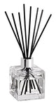Elegante cubo de vidrio realzado por su anillo plateado, y bouquet de 8 varillas negras, que animan su diseño contemporáneo.