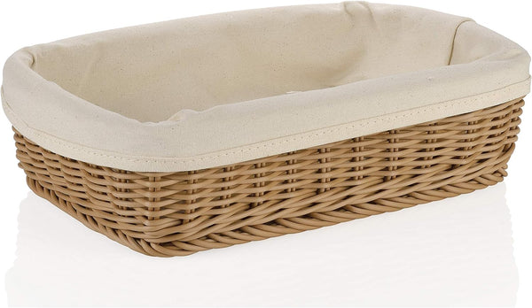 Bandeja de pan tradicional rectangular trenzada, que dispone en su interior de una tela en algodón beige que aporta un toque de decoración a la mesa a la vez que protege el pan del contacto directo con la cesta. Por su gran capacidad, podrás utilizarla para servir en comidas con varios comensales en tus reuniones con amigos y familiares.