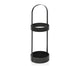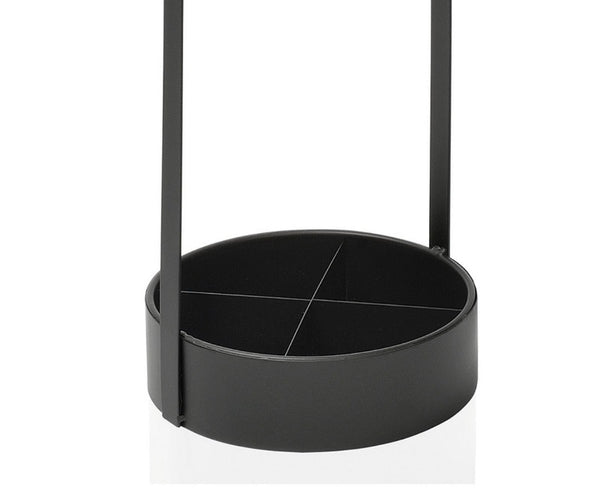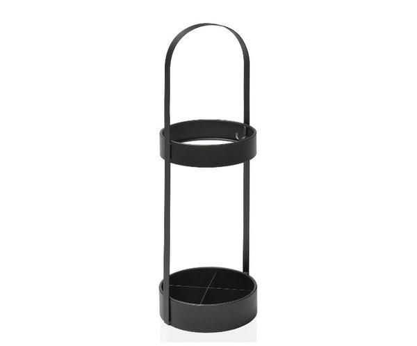 Este paragüero alto de forma cilíndrica está hecho de metal con un acabado negro. Tiene capacidad para cuatro o cinco paraguas altos y la base está dividida en cuatro compartimentos, para distribuir mejor los paraguas y que no se incline demasiado hacia los lados, pudiendo gotear sobre el suelo.