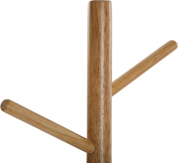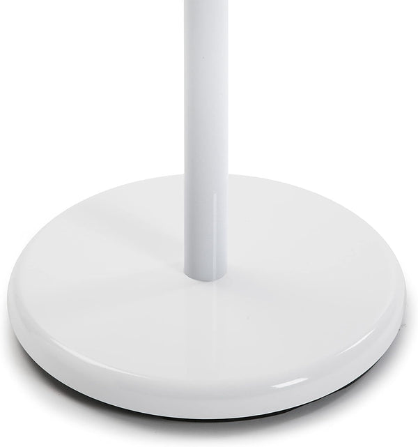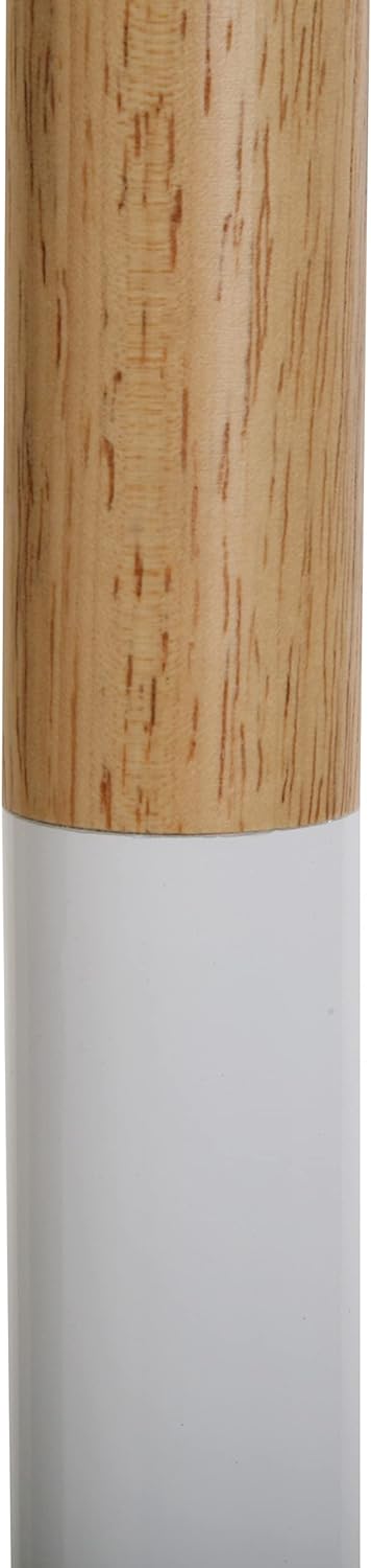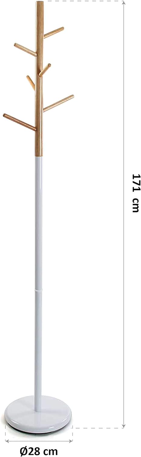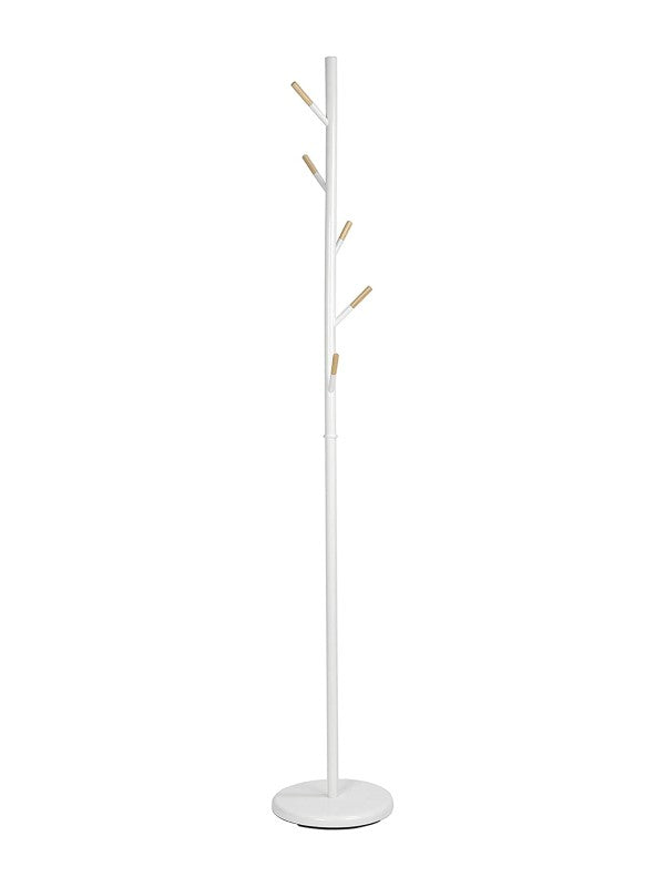 Este perchero de metal blanco tiene una base redonda y cinco ganchos acabados en madera natural, un detalle que le aporta frescor y naturalidad a este mueble auxiliar.