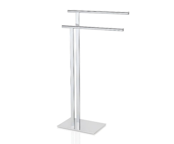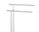Este toallero de pie proporciona dos soportes en forma de tubo, uno más alto para la toalla de ducha y otro más bajo para la toalla de mano.