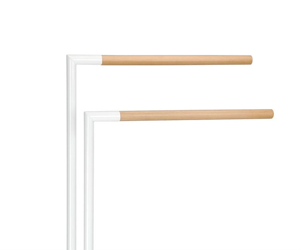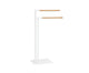 Este toallero de pie proporciona dos soportes en forma de tubo, uno más alto para la toalla de ducha y otro más bajo para la toalla de mano.