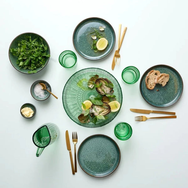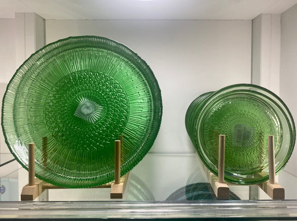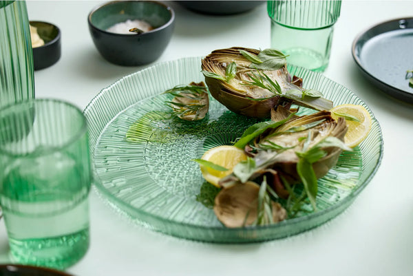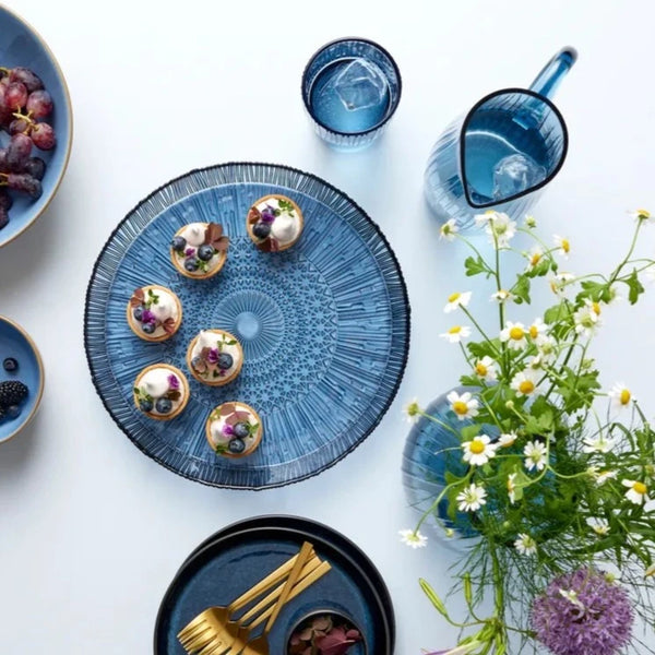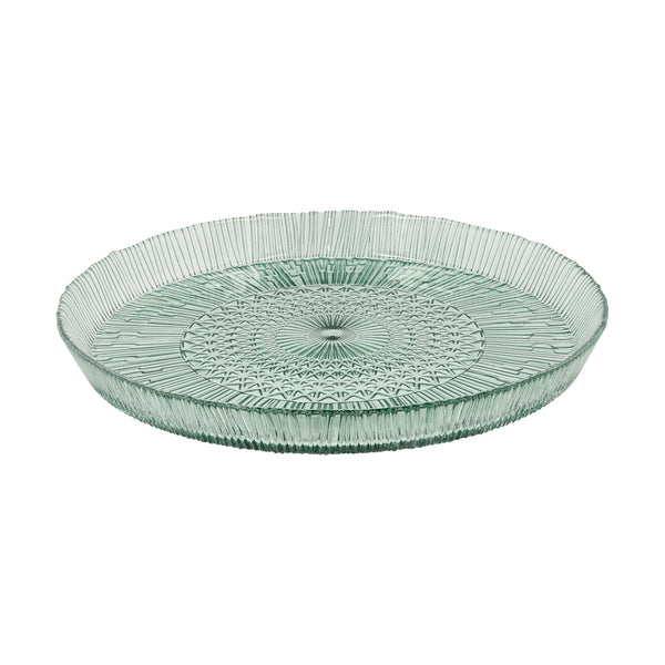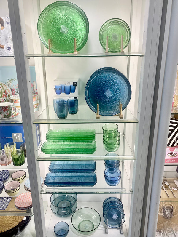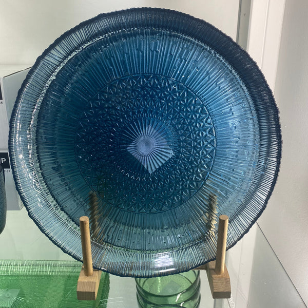 Elegante fuente de vidrio en dos tonalidades a elegir, azul o verde.