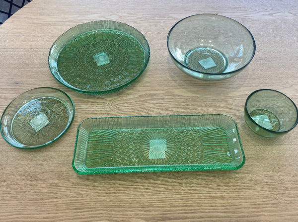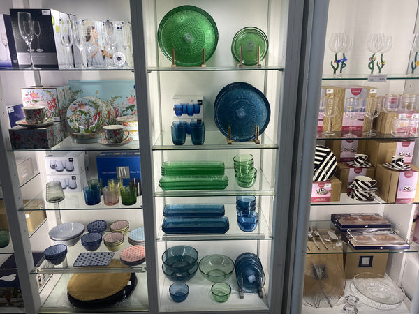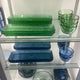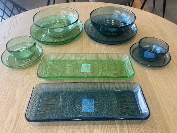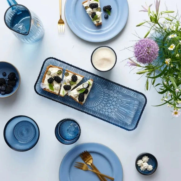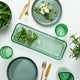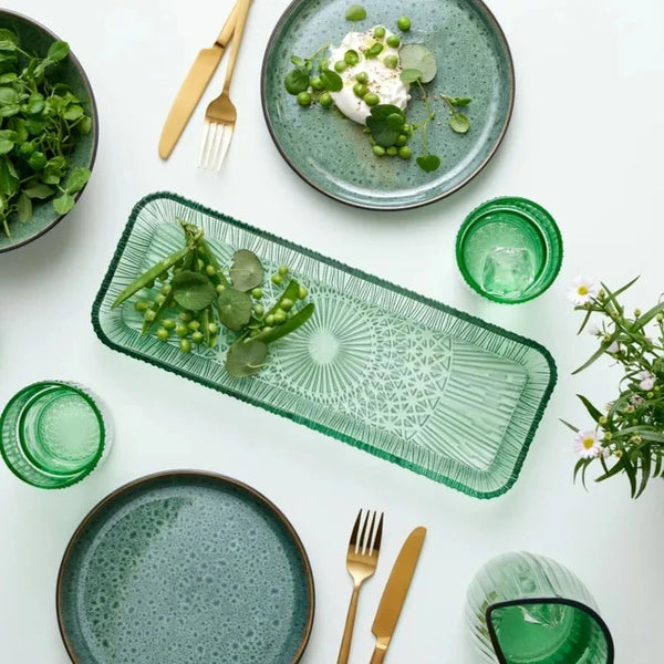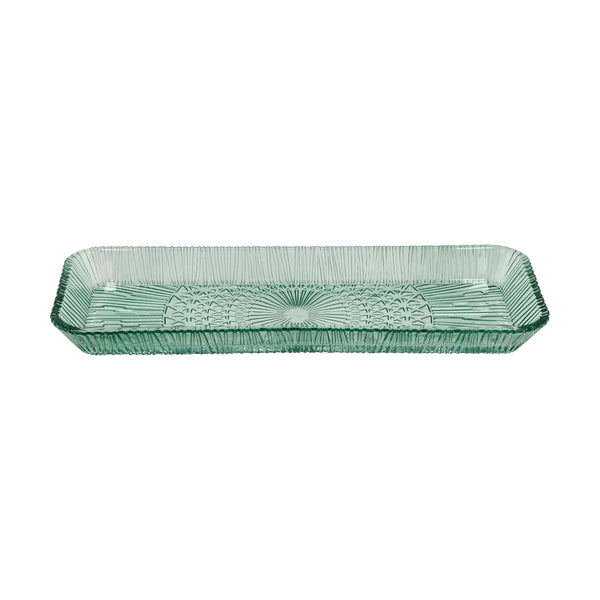 Fuente rectangular Kusintha* de 38 cm de largo realizada en vidrio, en dos tonos verde o azul a elegir, con la que realzar la presentación de los platos o postres añadiendo un toque de sofisticación a cualquier mesa.