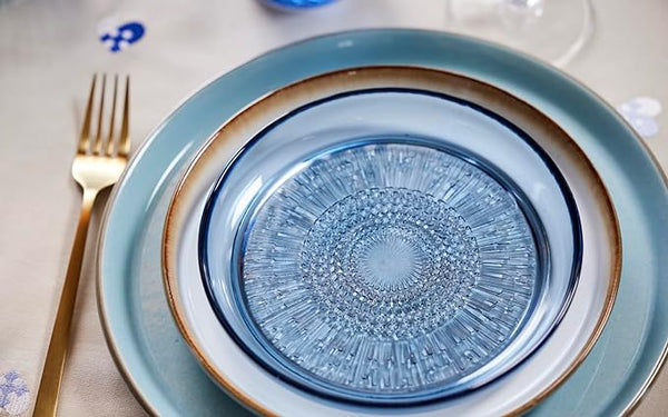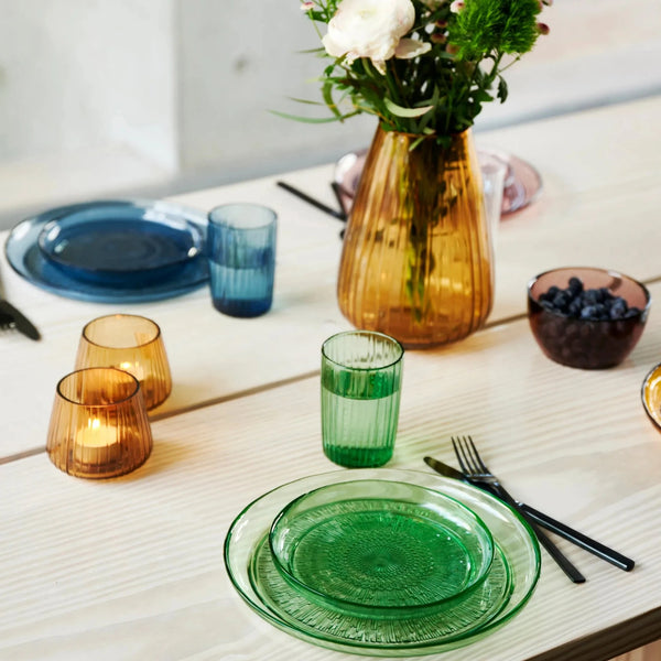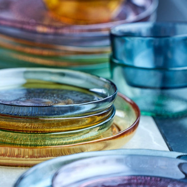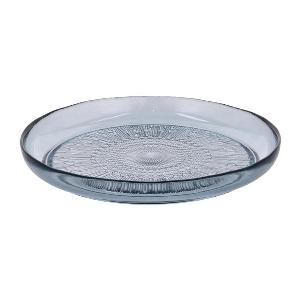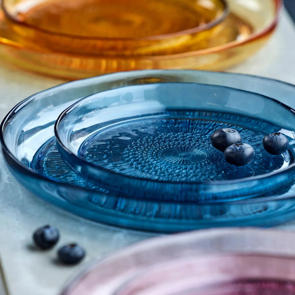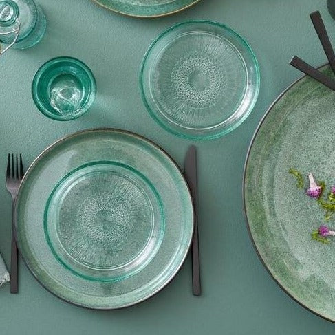 Elegante plato de vidrio de la colección Kusinth* de 18 cm de diámetro, está disponible en dos tonalidades, verde o azul, presenta un diseño que se adapta a la perfección a la decoración tanto clásica como moderna, siendo atemporal.