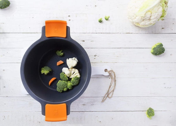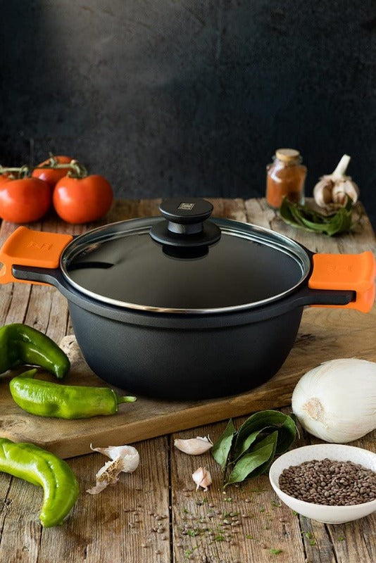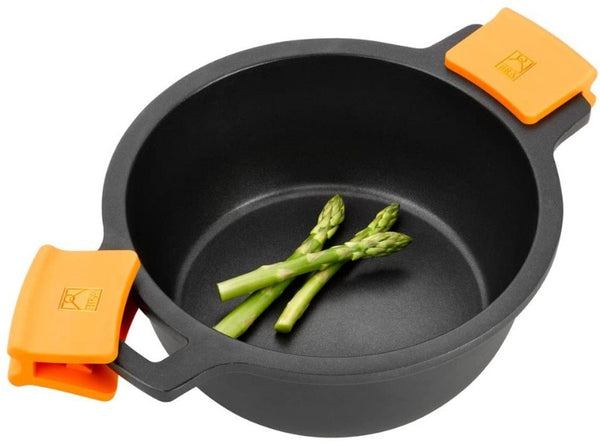 Incluye tapa y dos asas de silicona en color naranja para coger la cacerola con comodidad.