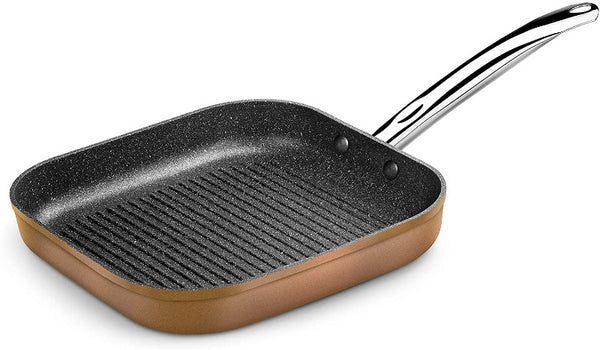 - Fabricado en aluminio forjado de la mejor calidad de 4 mm de espesor este grill con rayas con efecto exterior en estilo cobre metalizado distribuye el calor de forma más regular