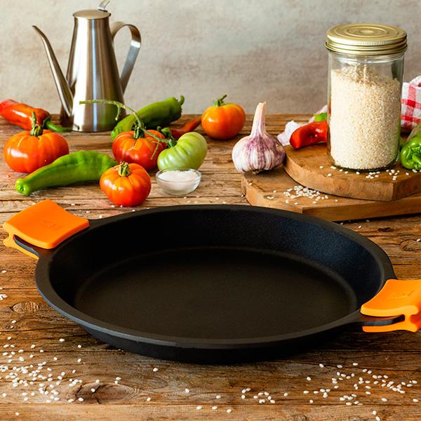 Incluye dos asas de silicona en color naranja para coger la paellera con comodidad.