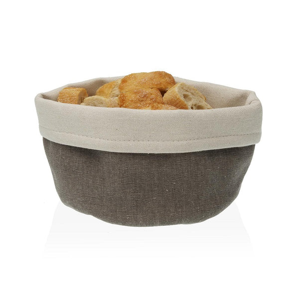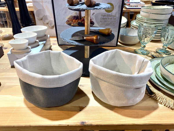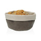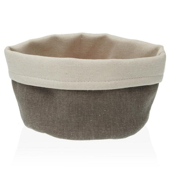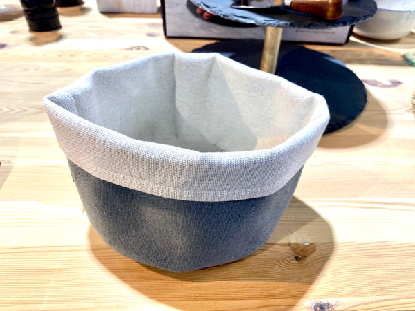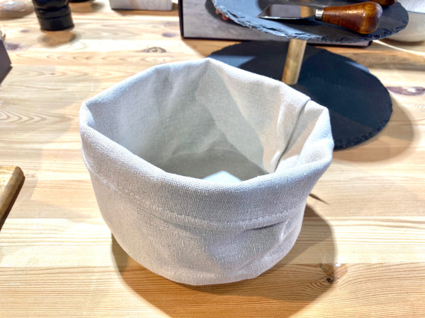 Cesta de tela, en color gris o beige.