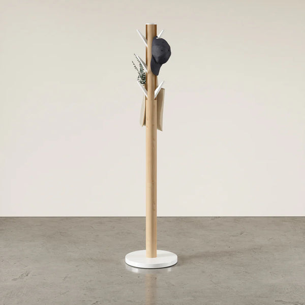 Moderno Y Elegante: Dé un toque natural a habitaciones interiores con este perchero de pie de madera.
