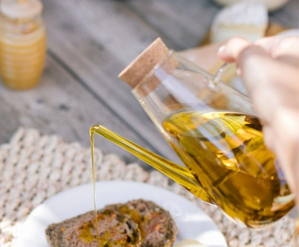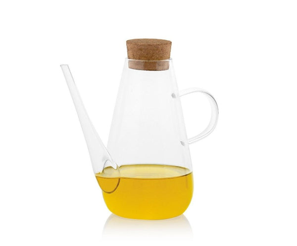 - Aceitera de gran tamaño, hecha de vidrio con tapón de corcho
