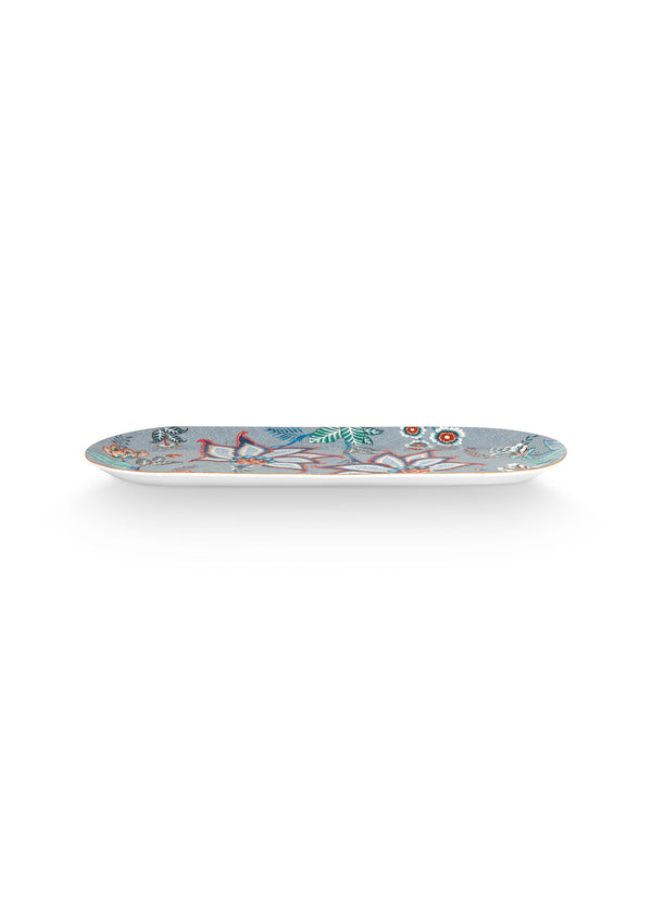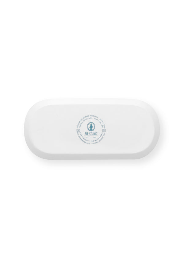 Elegante plato rectangular para pasteles realizado en porcelana con fondo azul, de la colección Flower Festival de Pip Studio.