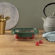 El vidrio de la base es borosilicato y es apto para microondas, lavavajillas y horno. También se puede colocar en la nevera y en el congelador. La tapa, de vidrio templado, es apta para lavavajillas, nevera y congelador.