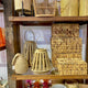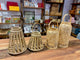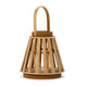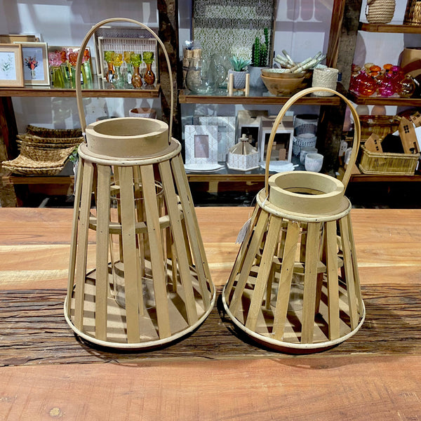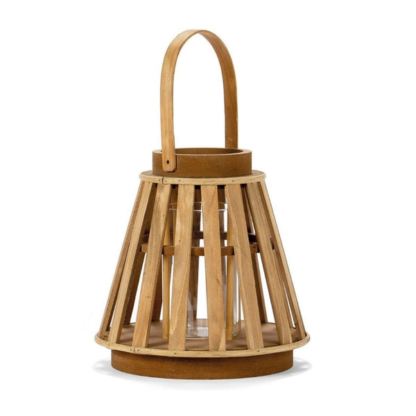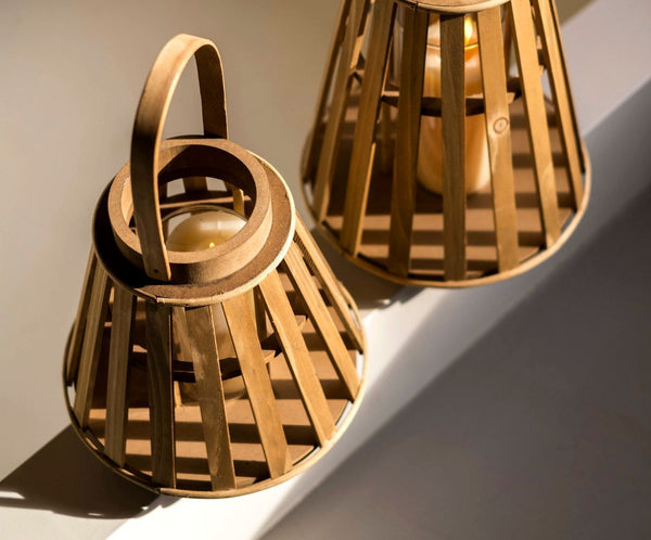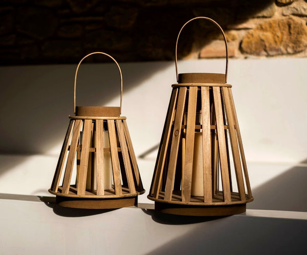 Este portavelas tiene forma cónica y está hecho con finas láminas de madera colocadas una al lado de la otra. Tiene un asa para poder transportarlo fácilmente de un espacio a otro.