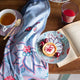 Plato de pastelería Flower Festival de 17 cm de diámetro, con un fondo azul y decorado con el elegante diseño Flower Festival. Este rico patrón floral presenta una variedad de extravagantes flores de chintz rojas y rosas con hojas de color azul claro y verde. Las ramas de flores colocadas de manera divertida con flores y hojas elaboradamente decoradas le dan a este elegante diseño un aspecto y una sensación extra lujosos.