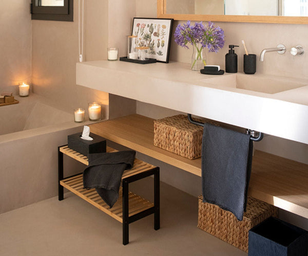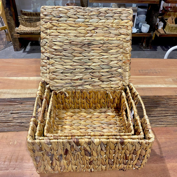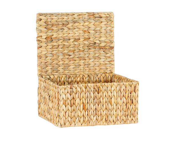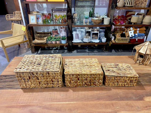 Cajas multiusos elaboradas en fibra natural. Están hechas de jacinto de agua, una fibra vegetal resistente y de aspecto rústico, que aporta frescor al hogar.