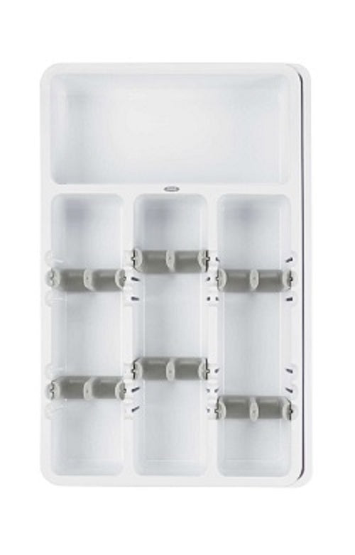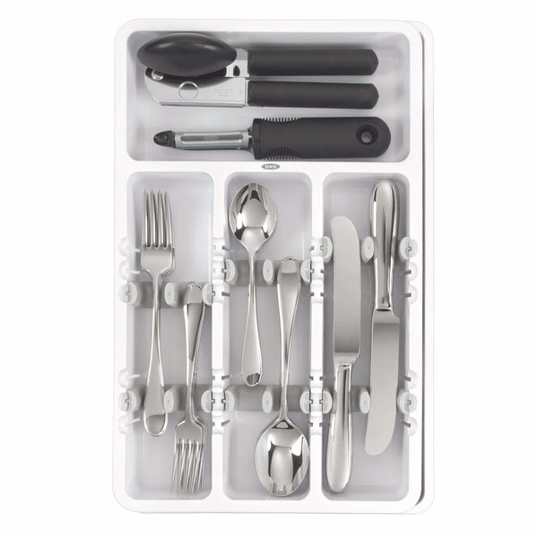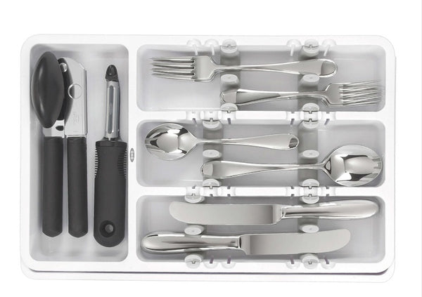 Aprovecha al máximo el espacio de los cajones para guardar más utensilios. Los divisores ajustables del organizador de utensilios expandible contiene más utensilios permitiéndole apilarlos en direcciones opuestas.