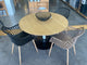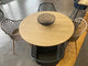 Mesa Bloom redondafija con un diseño moderno. La base central es de acero con recubrimiento de polvo negro, la parte superior es de MDF chapado en color natural con una capa protectora transparente.